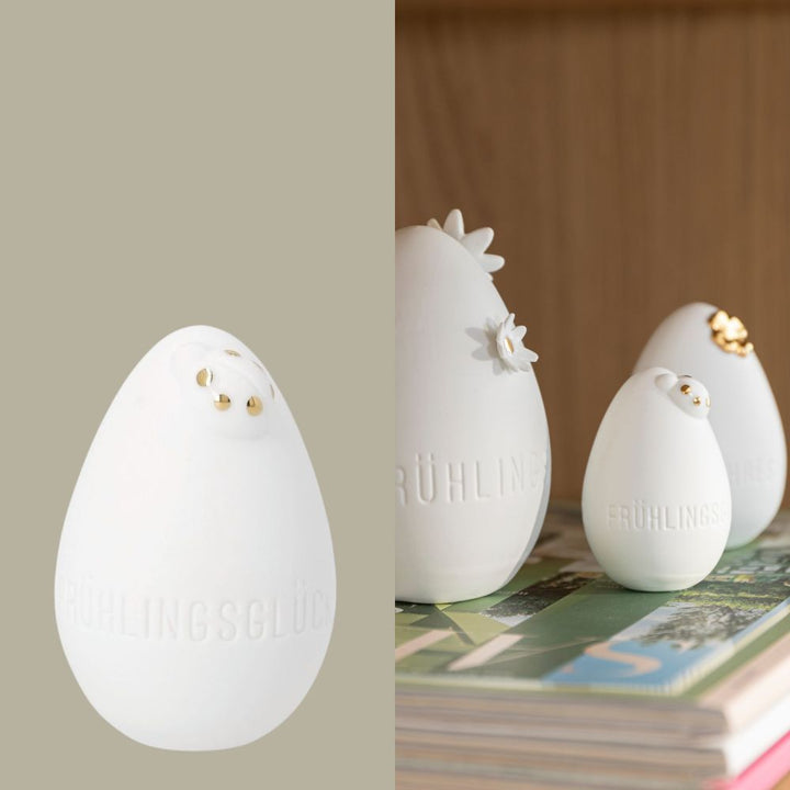 Das feine Porzellan in Kombination mit den dezenten goldfarbenen Akzenten verleiht dem Ei eine edle, hochwertige Ausstrahlung, ohne aufdringlich zu wirken. Ob auf der Fensterbank, dem Ostertisch oder als liebevolles Geschenk: Dieses Porzellanei erzählt leise von Frühling, Natur und kleinen Glücksmomenten.
