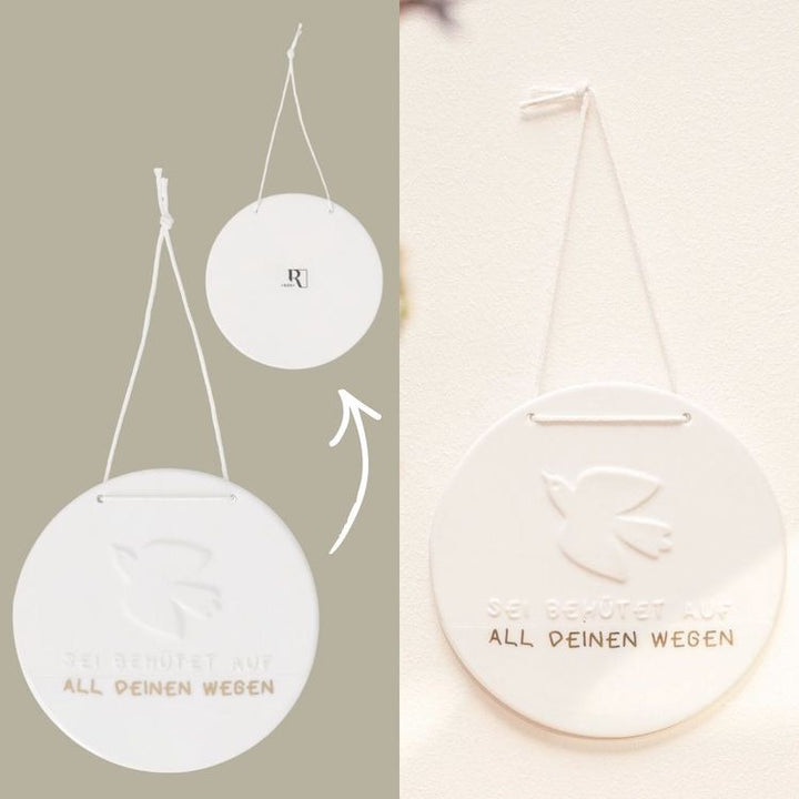 Die zarte, filigran eingearbeitete Taube auf dem Schild steht für Reinheit, Zuversicht und neue Wege. Sie erinnert daran, wie wertvoll die gemeinsamen Momente mit Familie und Freunden sind und dass jeder Schritt auf dem Lebensweg von Hoffnung und Geborgenheit begleitet wird.