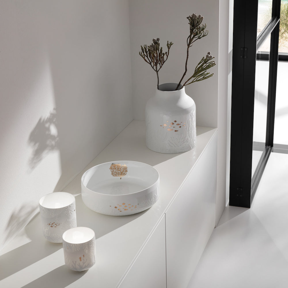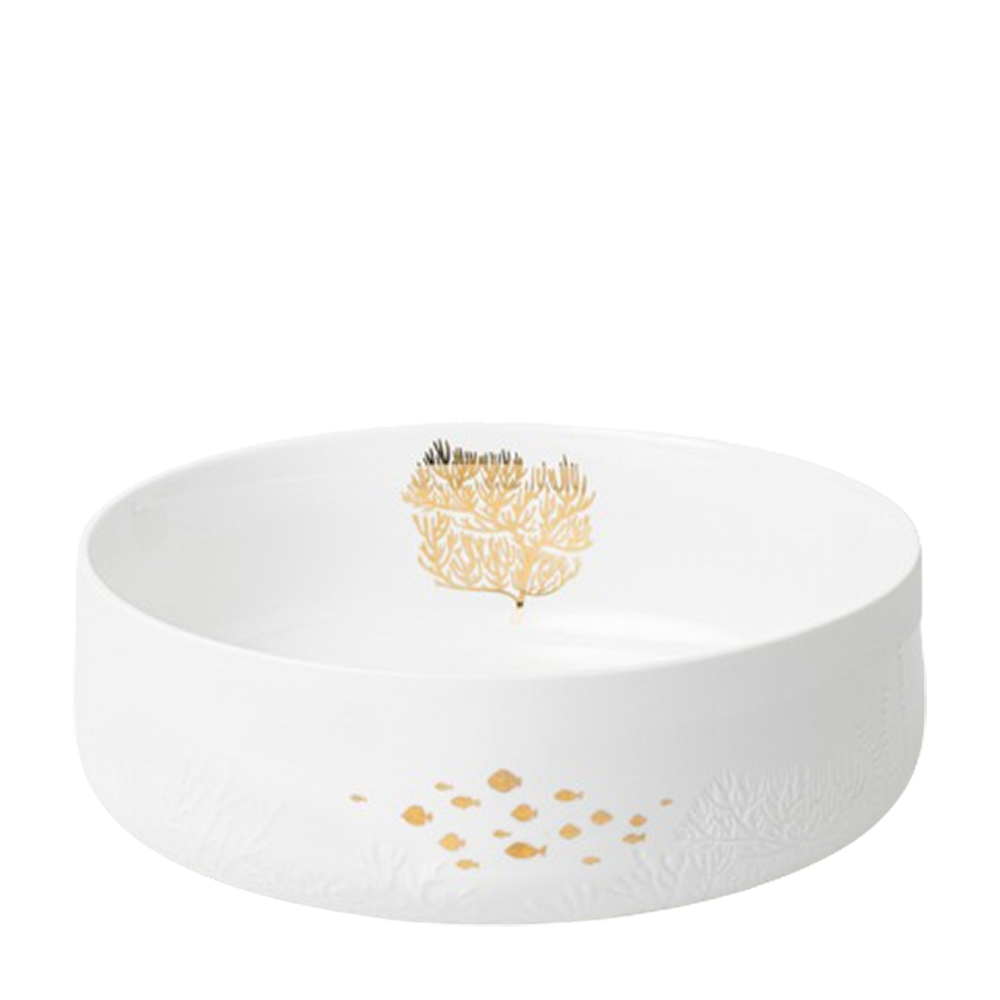 Wenn Du nach dem einen Hingucker für Deinen Tisch gesucht hast, dann bist Du mit der Räder Schale Fische fündig geworden. Mit ihrer Größe von 8,8 x 26,5 cm wird die Schale alle Blicke auf sich ziehen. Die goldfarbenen Details werden durch das weiße Porzellan, das teilweise mit Korallen- und Pflanzenprägungen versehen ist, toll zur Geltung gebracht. Gerne kannst Du die Räder Schale im Inneren auch dekorieren und mit Leuchtmitteln versehen, ganz wie es Dir beliebt!