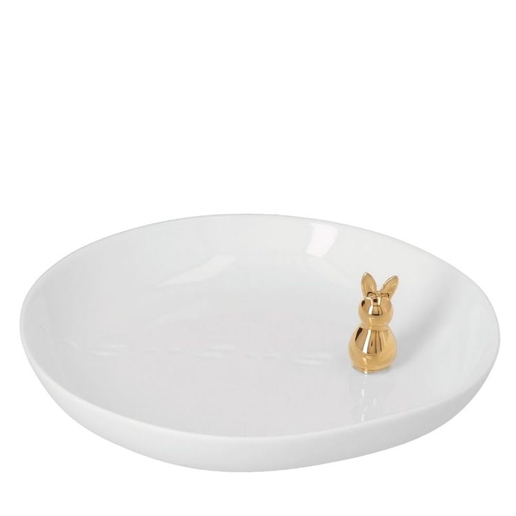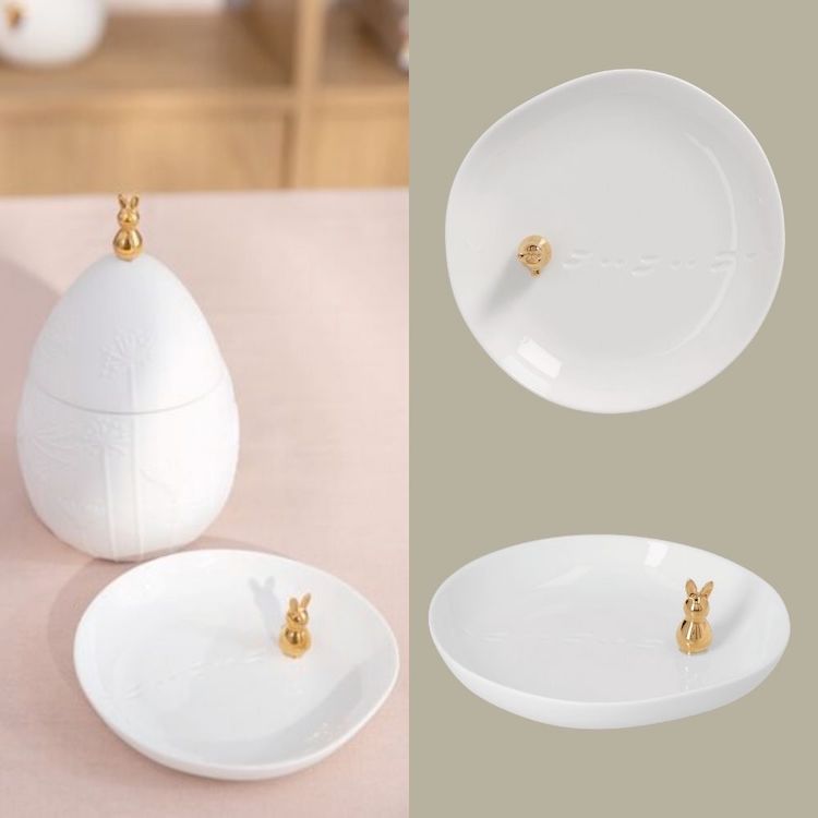 Wer ist denn da über das Porzellan gehoppelt? Das kleine, goldfarbene Häschen auf dieser wundervollen Schale von Räder strahlt vor Neugier – und wir verzeihen ihm das nur zu gern. Schnell ein paar Pralinchen oder kleine Naschereien dazugelegt, und schon ist die perfekte Osterüberraschung für deine Liebsten bereit.