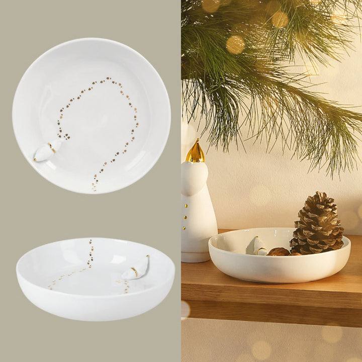 Wenn er dann aus seinem kleinen Traum aufwacht, hat er vielleicht den Duft von Weihnachtsgebäck in der Nase. Denn das hast Du vielleicht gerade in die mit einem Durchmesser von 20 cm üppig bemessene Schale gelegt. Oder waren es ein paar Nüsse?