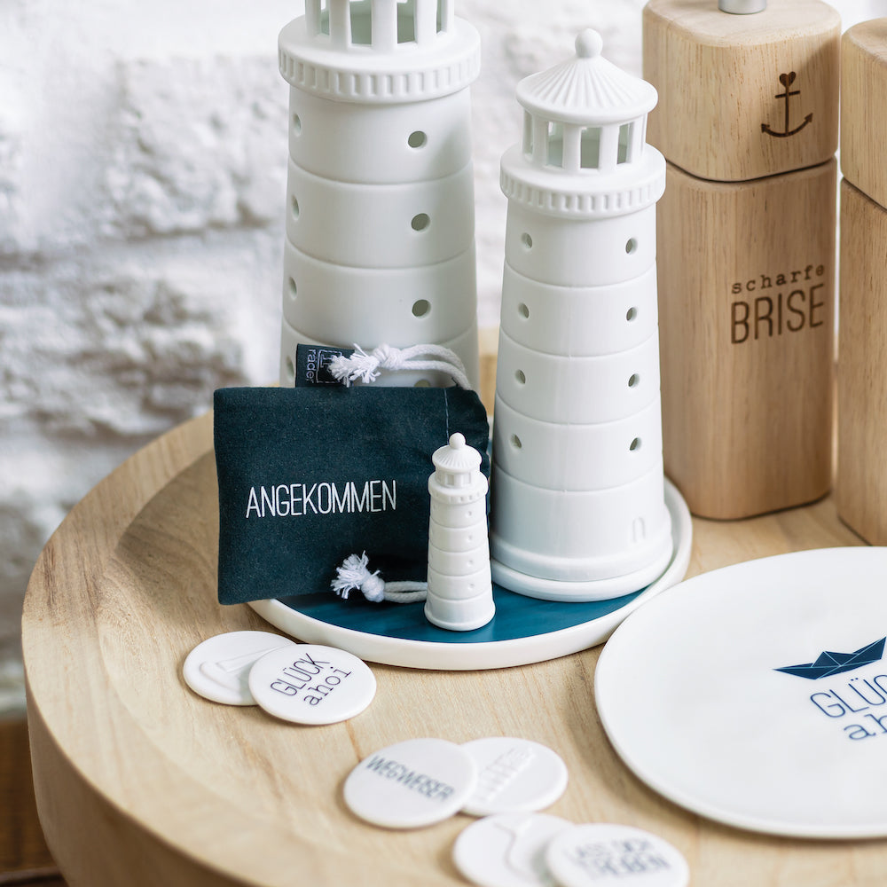 Das Räder Seesäckchen Angekommen ist eine tolle Geschenkidee für alle, die eine große Reise hinter sich haben oder im Leben angekommen sind. Wer freut sich nicht über diese kleine Aufmerksamkeit auf dem Kopfkissen oder neben dem Begrüßungscocktail. In dem blauen Säckchen verbirgt sich ein kleiner Leuchtturm aus Porzellan. Entdecke die Vielfalt von Räder hier in unserem Shop.