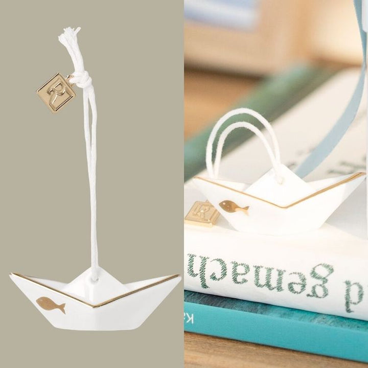 Du liebst Sonne, Strand und Meer? Dann haben wir genau das richtige Accessoire für dich – perfekt für all jene Momente, in denen der nächste Urlaub noch auf sich warten lässt. Mit diesem liebevoll gestalteten Porzellanhänger von Räder holst du dir maritimes Flair nach Hause und kannst ganz entspannt vom nächsten Sommerurlaub träumen. Das detailreiche Segelschiff wird von einem kleinen, goldfarbenen Fisch geschmückt, der dem schlichten Design einen besonderen Akzent verleiht. Ob am Fenster, an Zweigen oder als Teil einer maritimen Dekoration – der Anhänger fügt sich harmonisch in verschiedenste Wohnstile ein und setzt dezente, elegante Akzente. Mit seiner kompakten Größe von 4,9 × 1,9 × 1,9 cm ist der Porzellanhänger ein kleines, aber feines Schmuckstück, das Leichtigkeit und Urlaubsgefühle ausstrahlt. Das hochwertige Porzellan unterstreicht den zeitlosen Charakter und macht den Anhänger zu einem stilvollen Detail für dein Zuhause. Kleiner Tipp: Auch als Geschenkanhänger für Meerverliebte eignet sich das glasierte Schiffchen ganz wunderbar.