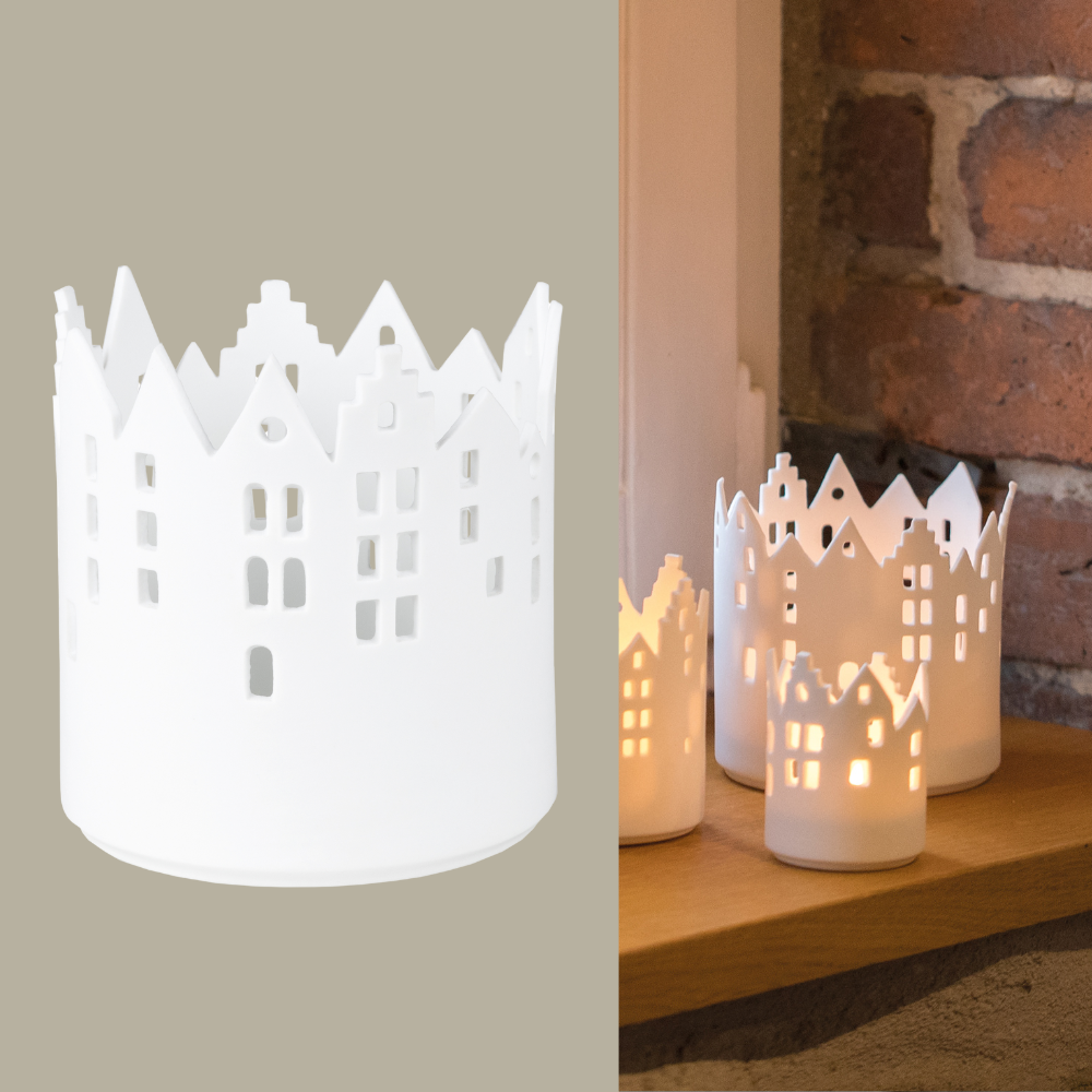 Das weiße Stadtlicht Marktplatz von Räder mit seinen zahlreichen Fenstern ist aus feinstem Porzellan handgefertigt. Mit einem Teelicht bestückt, verbreitet das Schmuckstück ein angenehmes Licht und lädt zum Träumen ein. Lasse auch Du Dich von unseren Räder-Produkten verzaubern.
