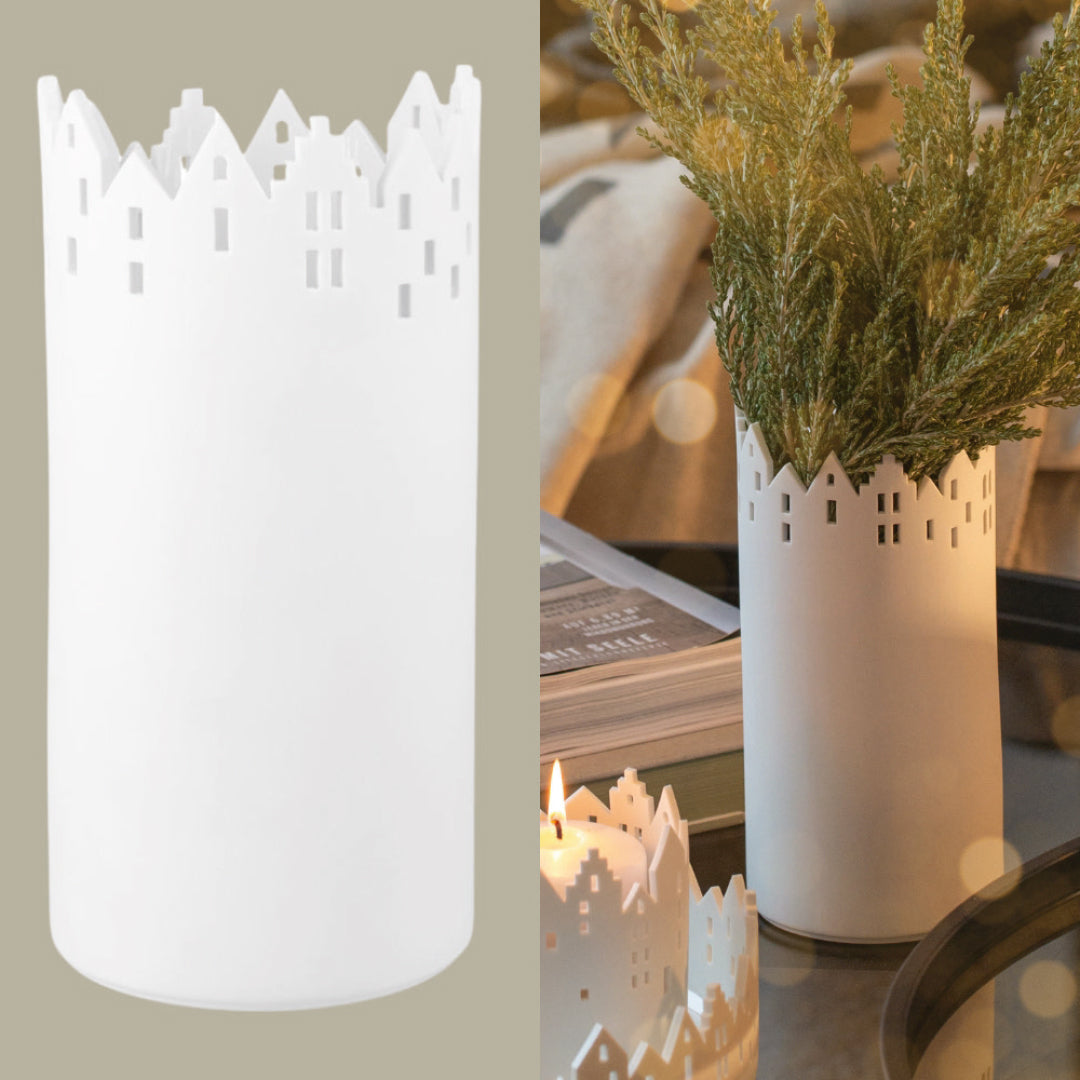 Im unteren Teil besticht sie durch eine klare, klassische, zylindrische Form, doch der Zauber der Stadtvase kommt im oberen Teil zur Geltung, wo sich eine bezaubernde Stadtsilhouette über dem zylindrischen Teil erhebt.