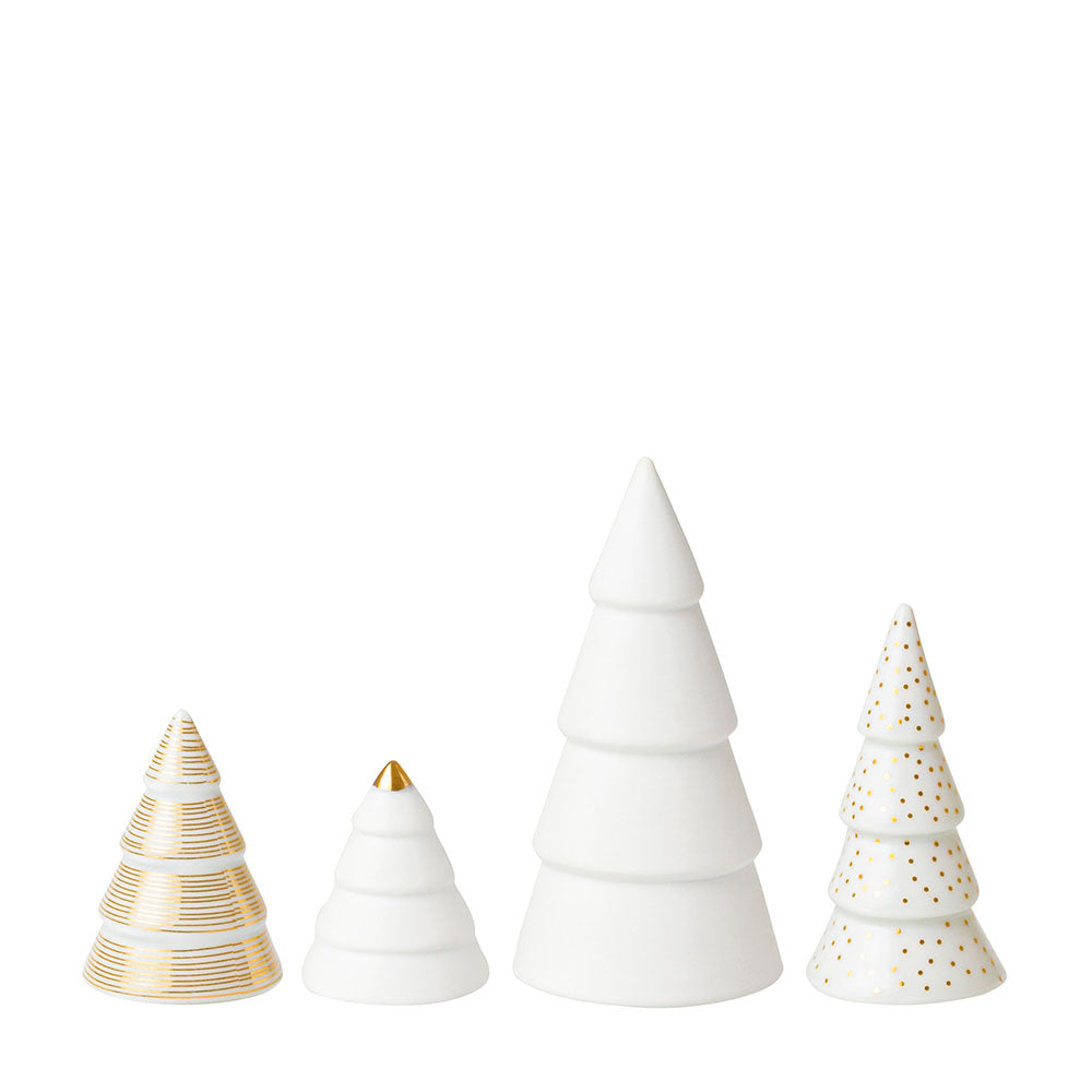 Denn die Porzellangeschichten wurden entwickelt, um unsere Phantasie anzuregen und unsere Gedanken und Gefühle tanzen zu lassen. Deswegen sind die Tannen dieses Sets auch nicht einfach nur porzellanweiß. Die größte der vier ist es zwar, doch die anderen bezaubern durch goldfarbene Details. Sei es eine Baumspitze, ein paar Sterne, die sich auf eine der Tannen gesetzt hat oder goldene Streifen.