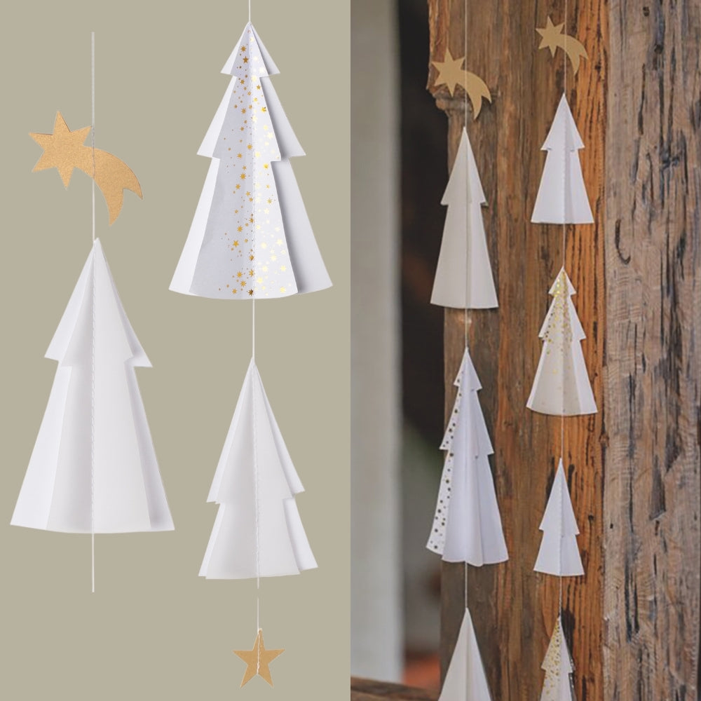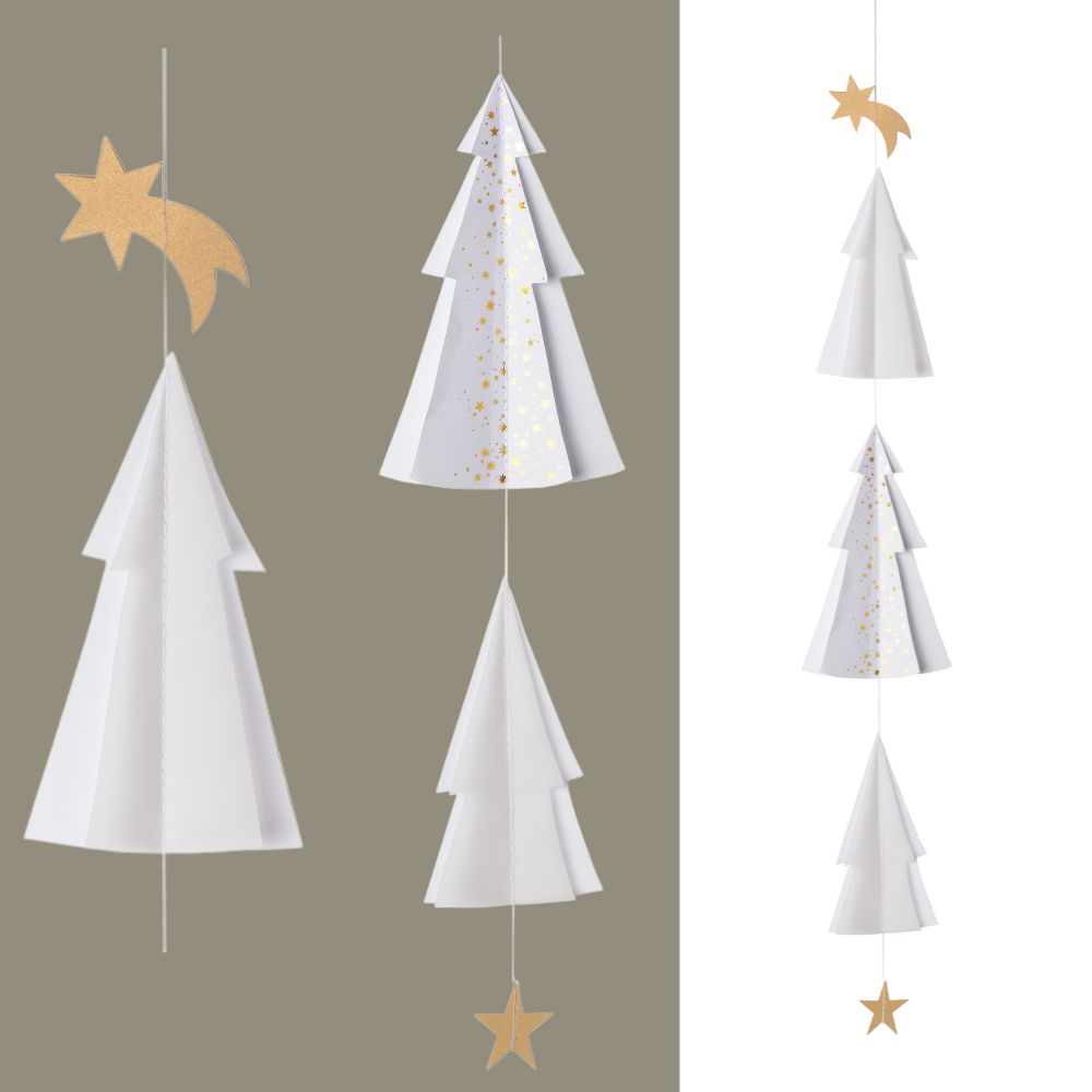 Die Tannenkette gibt es in zwei Versionen mit unterschiedlicher Länge und unterschiedlich vielen aus Papier gefertigten Bäumen. Die kürzere Version enthält drei Tannenbäume und hat eine Länge von 57 cm, womit sie sich wunderbar für Deine Fenster oder Türen eignet. Schau Dir gerne auch hier in unserem Onlineshop die längere Version an und lass Dich von der Stimmung, die diese Ketten vermitteln, verzaubern.