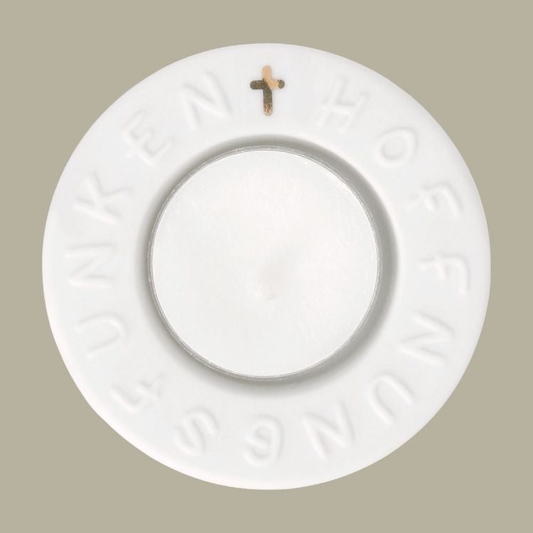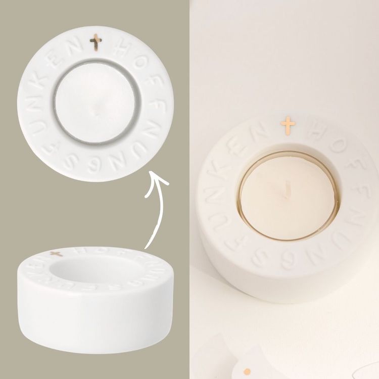 Der Teelichthalter trägt ein kleines goldfarbenes Kreuz zwischen den geprägten Buchstaben für das Wort Hoffnungsfunken, das ihm einen feierlichen Akzent verleiht. Mit seinen kompakten Maßen fügt er sich harmonisch in jede Tischdekoration ein – auf dem Familientisch, der Kaffeetafel nach der Feier oder als liebevolles Geschenk für die Jubilarin oder den Jubilar.