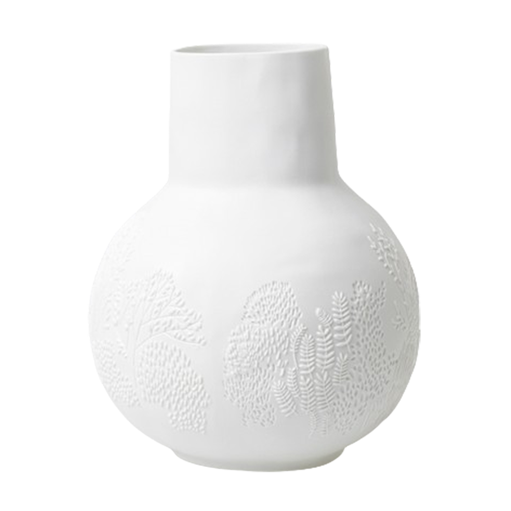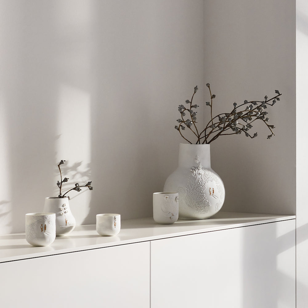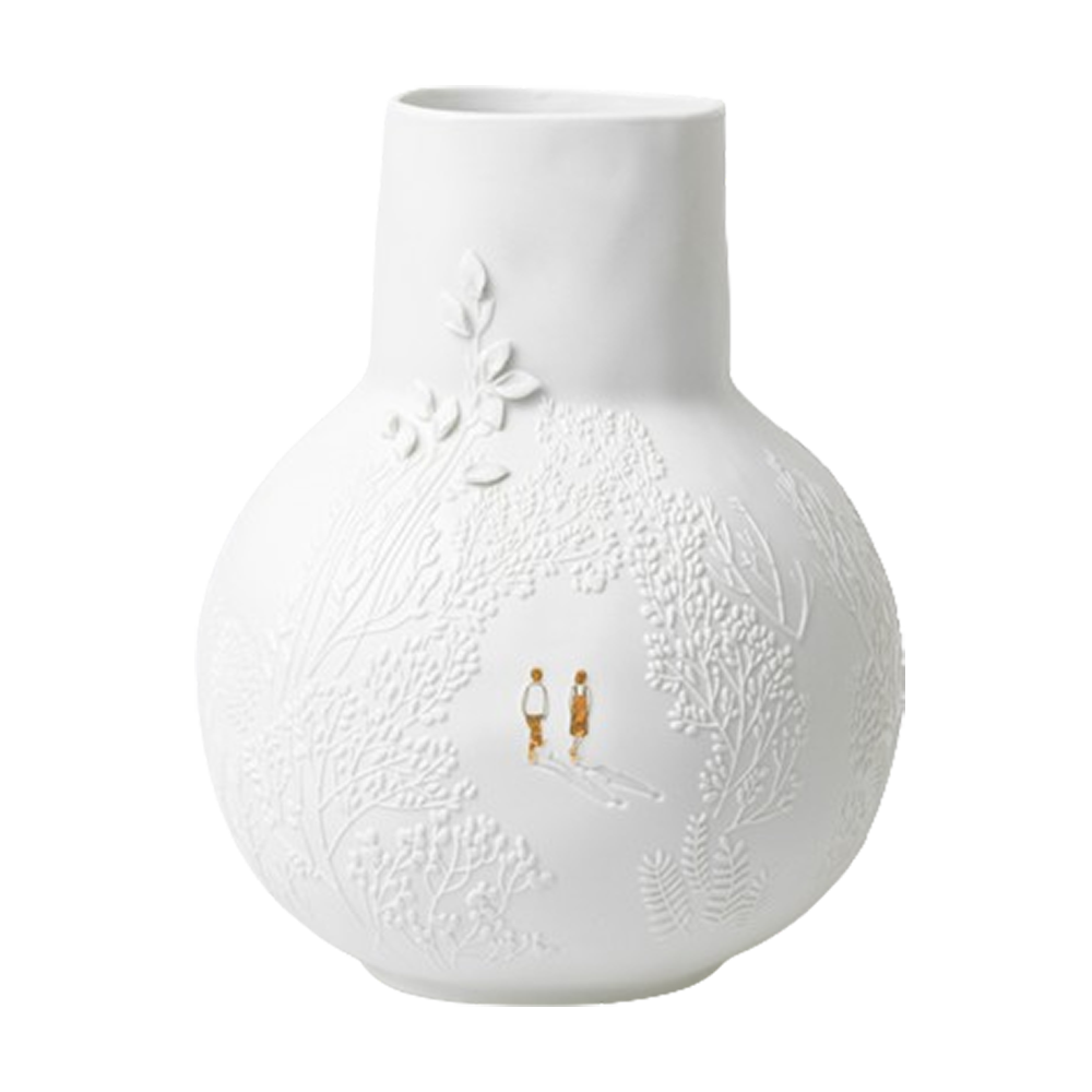 Die Räder Vase Spaziergang ist unser neuer Favorit, denn sie ist der perfekt Hingucker. Die runde Form wird durch die zylinderförmige Öffnung toll abgerundet. Aber vor allem die vielen Prägungen im Porzellan, die Blätter und Pflanzen darstellen, die sich um die Vase ranken, machen sie so einzigartig. Hast Du schon zwischen den Zweigen die goldfarbenen Silhouetten entdeckt? Vielleicht handelt es sich dabei um ein verliebtes Paar, das gerade einen schönen Spaziergang in der Sonne genießt. Die ausgefallene Vase von Räder hat übrigens eine Höhe von 25 und einen Durchmesser von 20,5 cm. Jetzt fehlt nur noch ein Strauß Deiner Lieblingsblumen!