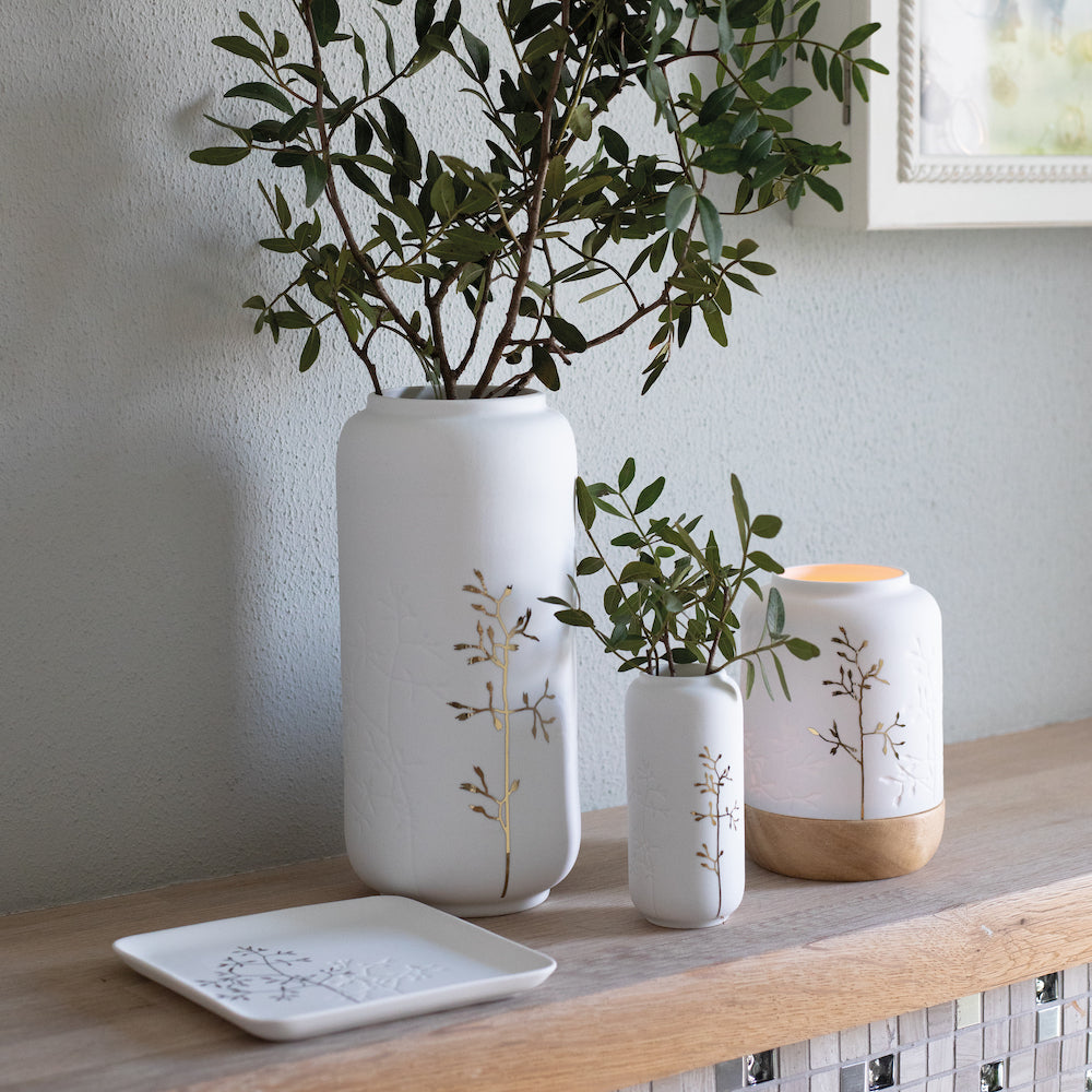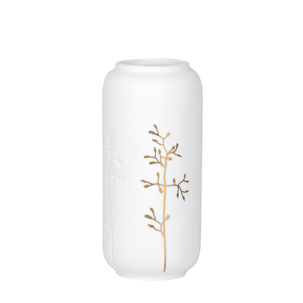 Die kleine Vase von Räder wird durch den goldfarbenen Zweig an der Vorderseite zum trendigen Hingucker auf dem Tisch, der Kommode oder dem Sideboard. Die Vase aus Porzellan misst übrigens 10 x 4,8 cm, sodass vor allem einzelne Zweige und Blumen in der modernen Räder Vase toll zur Geltung kommen.