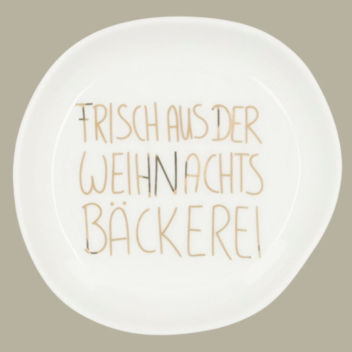 Hat man sich bis zum Boden der Schale vorgearbeitet, was echten Naschkatzen und Leckermäulern bestimmt nicht schwer fällt, dann ist in goldener und teilweise schwarzer Schrift zu lesen, wo die Köstlichkeiten produziert wurden: Selbstverständlich in der Weihnachtsbäckerei.