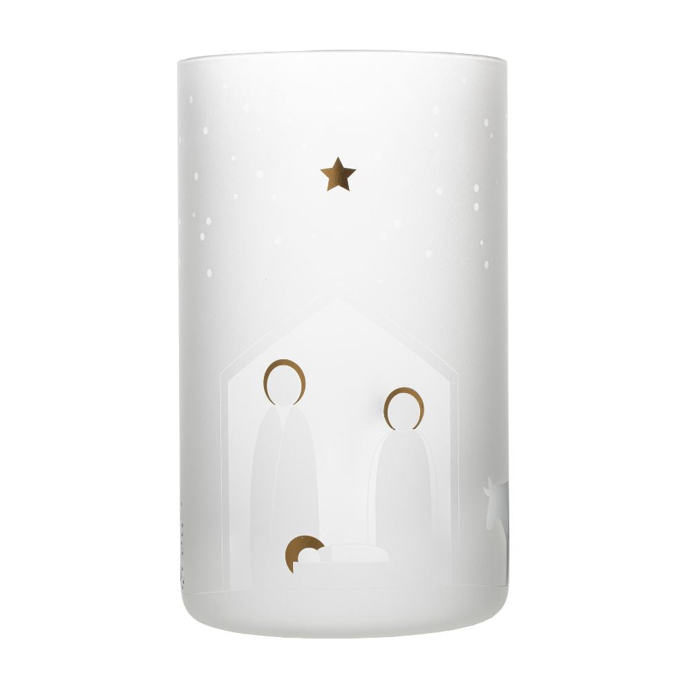 Auf einem beeindruckenden Windlicht mit einer Höhe von 30 cm und einem Durchmesser von 18 cm ist die heilige Familie auf einzigartige Weise dargestellt.