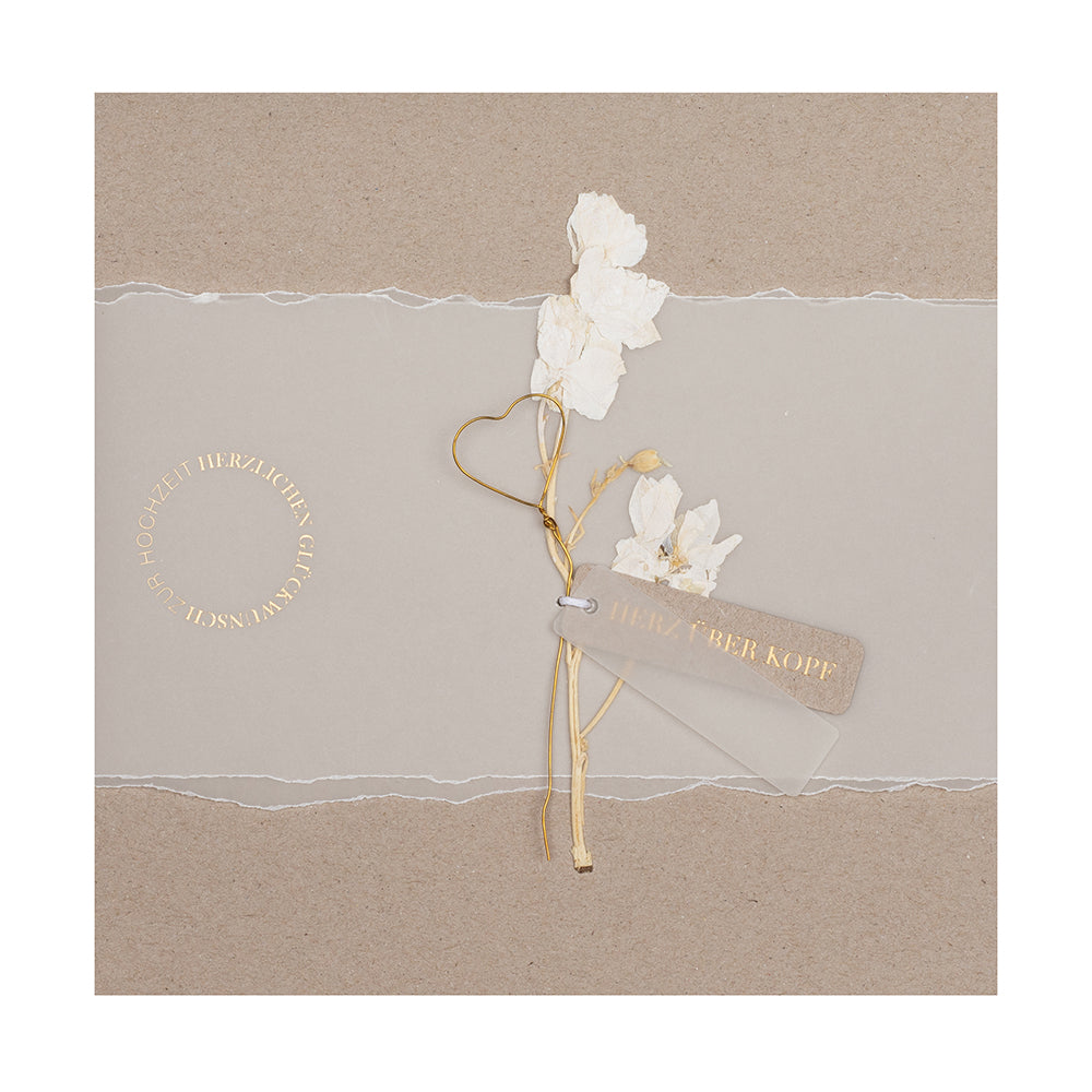 Ganz im eleganten Stil von Räder wirst Du zur nächsten Hochzeit mit der Räder XL Hochzeitskarte Herz über Kopf Deine Glückwünsche mitteilen. 17 x 17 cm ist die Papierkarte groß und hat auf der Vorderseite schöne Details wie echte Trockenblumen und ein goldfarbenes Drahtherz. Das Beste an der Karte von Räder ist natürlich, dass die frisch Vermählten die Karte aufstellen und sich so noch eine lange Zeit an Deinen Glückwünschen erfreuen können.