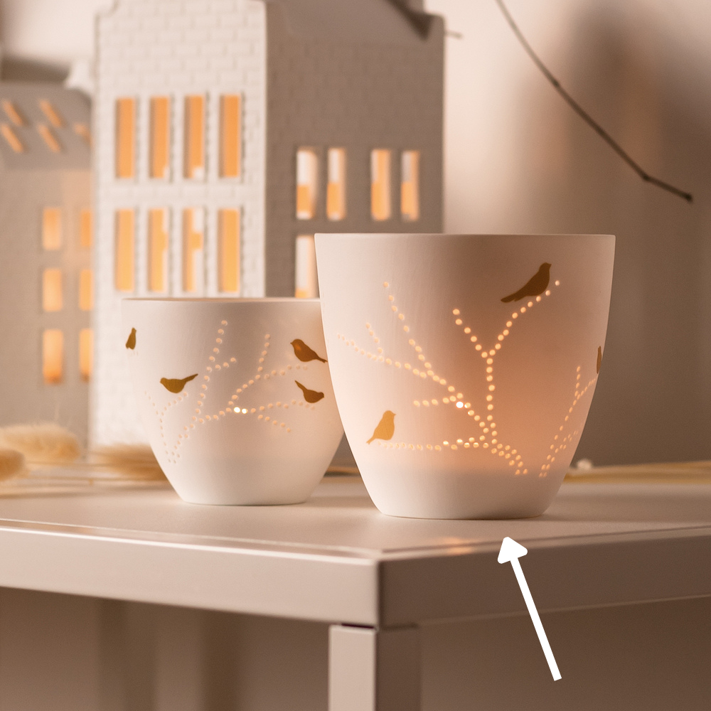 Bei dem Poesielicht Vögel von Räder muss man einfach zuschlagen! Die goldenen Vögel auf ihren Ästen, die als Lochmuster abgebildet sind, machen Dein Windlicht einzigartig. 9 x 9 cm misst das Poesielicht Vögel und bietet somit ausreichend Platz für ein Teelicht oder eine kleine Kerze, um für eine gemütliche Stimmung zu sorgen.