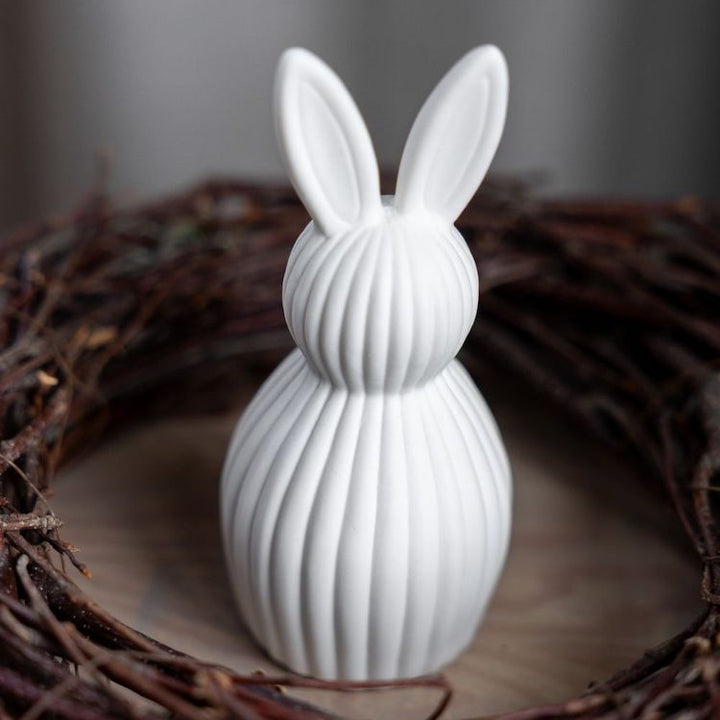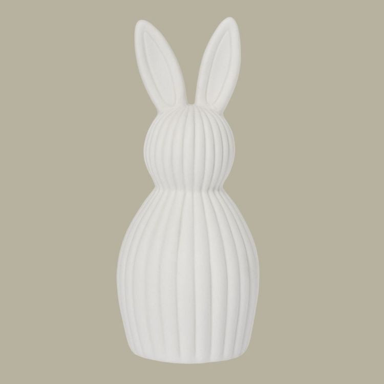 Der Hase ist ein kleines Detail mit großer Wirkung. Auf der Fensterbank fängt er das Tageslicht ein, auf dem Ostertisch sorgt er für eine helle, freundliche Stimmung und auf einem Regal setzt er einen ruhigen Akzent. Allein platziert wirkt er reduziert und elegant, in Kombination mit weiteren Osterfiguren oder natürlichen Materialien entsteht eine liebevolle, frühlingshafte Szenerie.