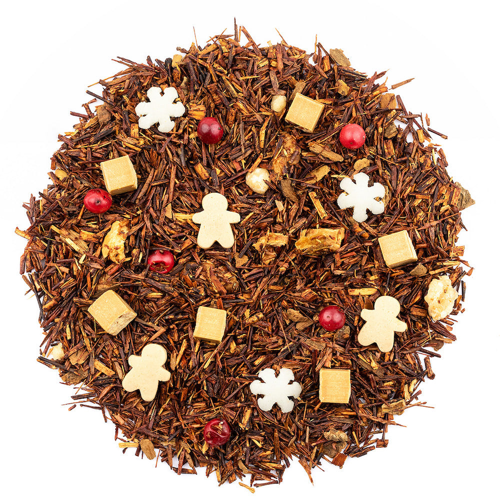 Zutaten: Rotbuschtee, Apfelstücke, Sahne-Karamellstücke (gezuckerte KONDENSMAGERMILCH, Zucker, Glukosesirup, Butterfett, Feuchthaltemittel: Sorbit, Emulgator: Mono- und Diglyceride von Speisefettsäuren), Aroma, Krokantstücke (Zucker, HASELNUSSKERNE, Invertzucker), Zimtstücke, Zuckerlebkuchenmänner (Zucker, Reismehl, Rapsöl (ganz gehärtet), Kakaopulver, Kartoffelstärke, Farbstoff E 172, Aroma), Zuckereiskristalle (Zucker, Reismehl, Reisöl, Verdickungsmittel: Kartoffelstärke, Aroma), rosa Pfefferkörner.