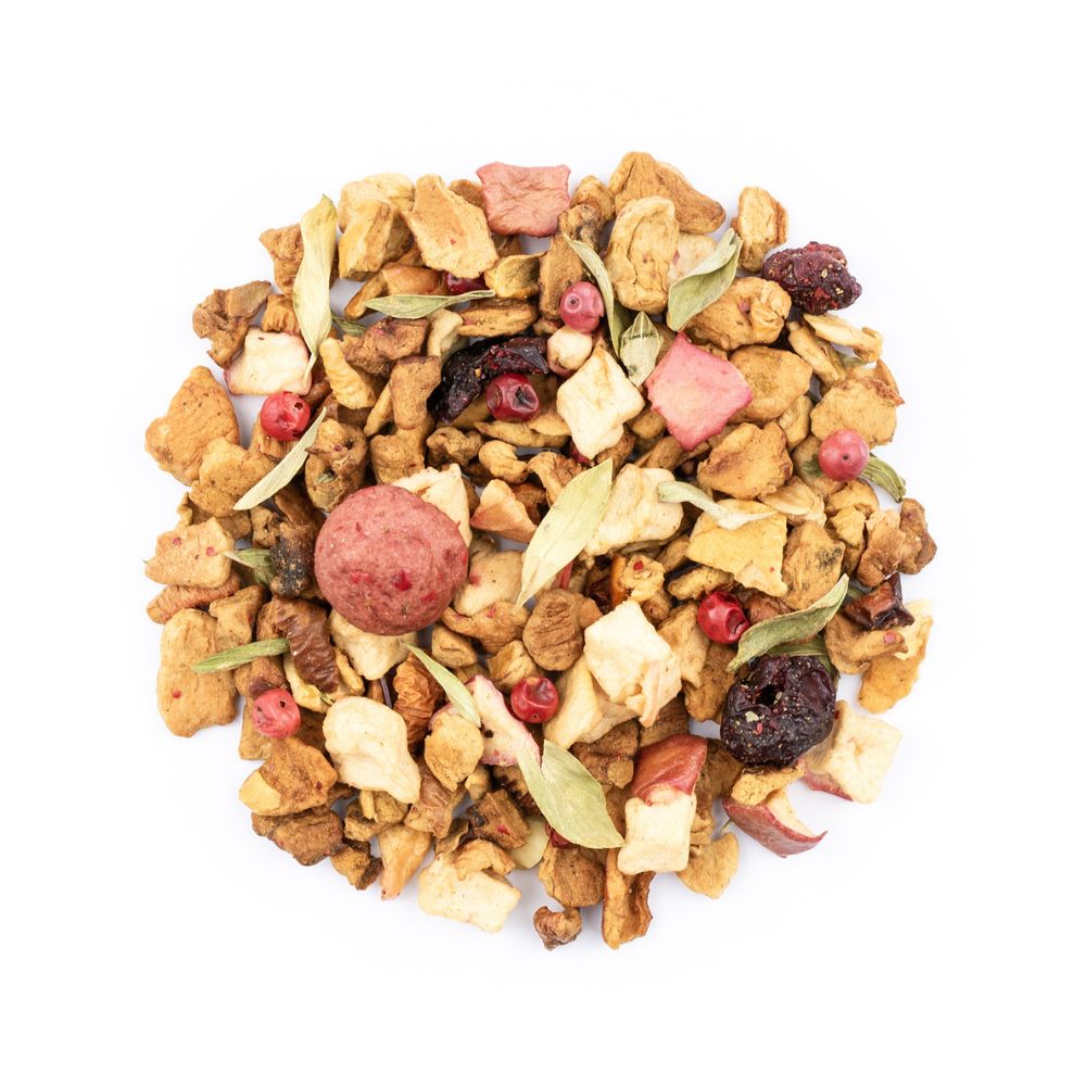 Ein Tee wie das erste Weihnachtslied, das durchs Haus klingt. Süßliche Apfelstücke und sanfte Mandelnoten bilden die wohlige Basis dieser Mischung. Gefriergetrocknete Sauerkirschen und fruchtige Kirsch-Drops sorgen für eine fein-säuerliche Frische, während eine Prise rosa Pfeffer und ein Hauch Bergthymian für das gewisse Etwas sorgen – überraschend, festlich, rund.