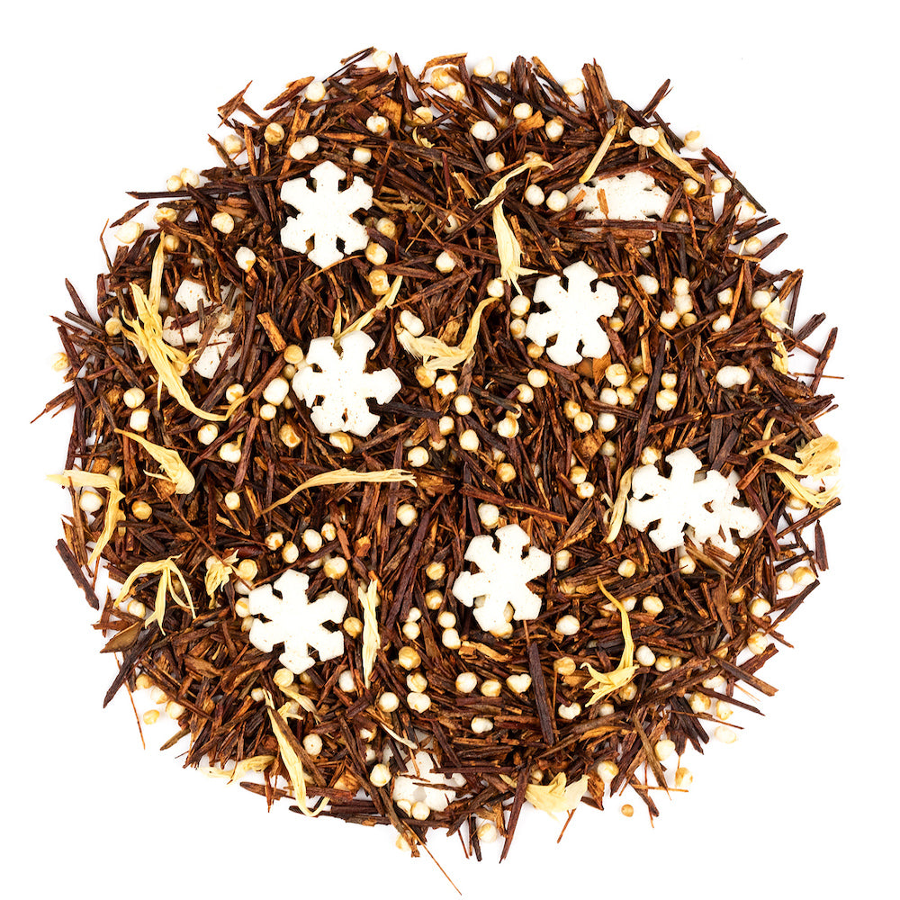 Zutaten: Rooibos, ZUCKER-EISKRISTALLE (Zucker, Reismehl, GEHÄRTETES ERDNUSSÖL, Kartoffelstärke, Aroma), gepoppter Amaranth, Aroma, weiße Kornblumenblüten.