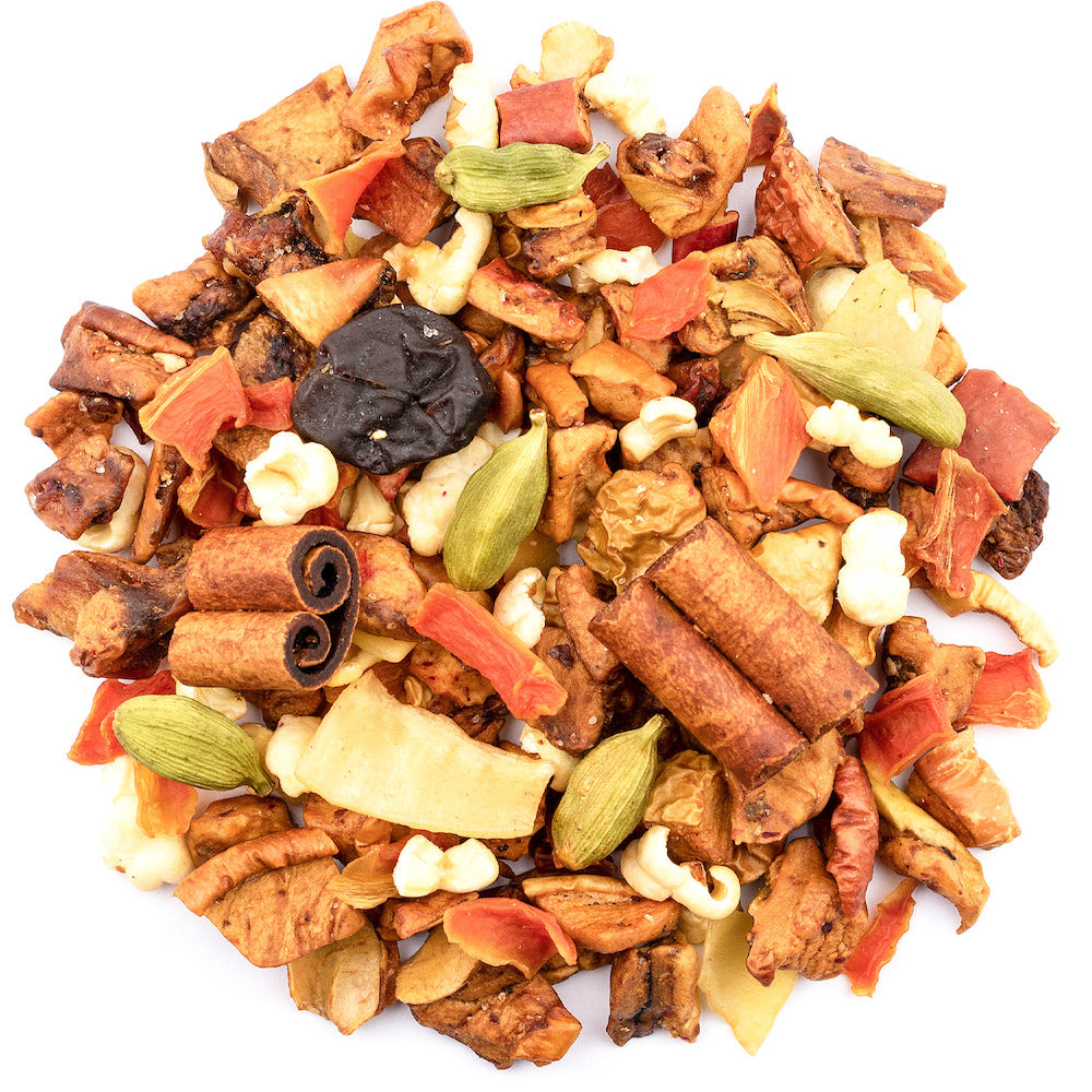 Zutaten: Aromatisierte Apfelstücke (Apfel, Aroma, Säuerungsmittel: Zitronensäure, Ascorbinsäure), geölte Weinbeeren (Weinbeeren, Sonnenblumenöl), kandierte Kirschen (Kirschen, Zucker, Sonnenblumenkernöl) (8 %), Aroma, Karottenflocken, gesüßte Kokoschips (Kokosnuss, Zucker), Cassiarinde gerollt, Kardamom, gepuffter Reis, gefr.-getr. Kirschen (2 %), Rote Bete-Würfel.