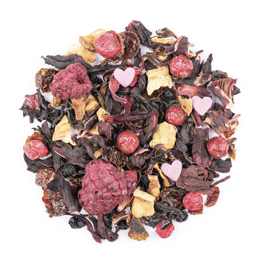 Hibiskusblüten, Hagebuttenschalen, Apfelstücke, Fliederbeeren, Zuckerherzen rosa (Zucker, Reismehl, Reisöl, Kartoffelstärke, Aroma, Rote Bete Saftkonzentrat), Aroma, Bergblaubeerblätter, gefr.-getr. ganze Himbeeren, gefr.-getr. Johannisbeeren.