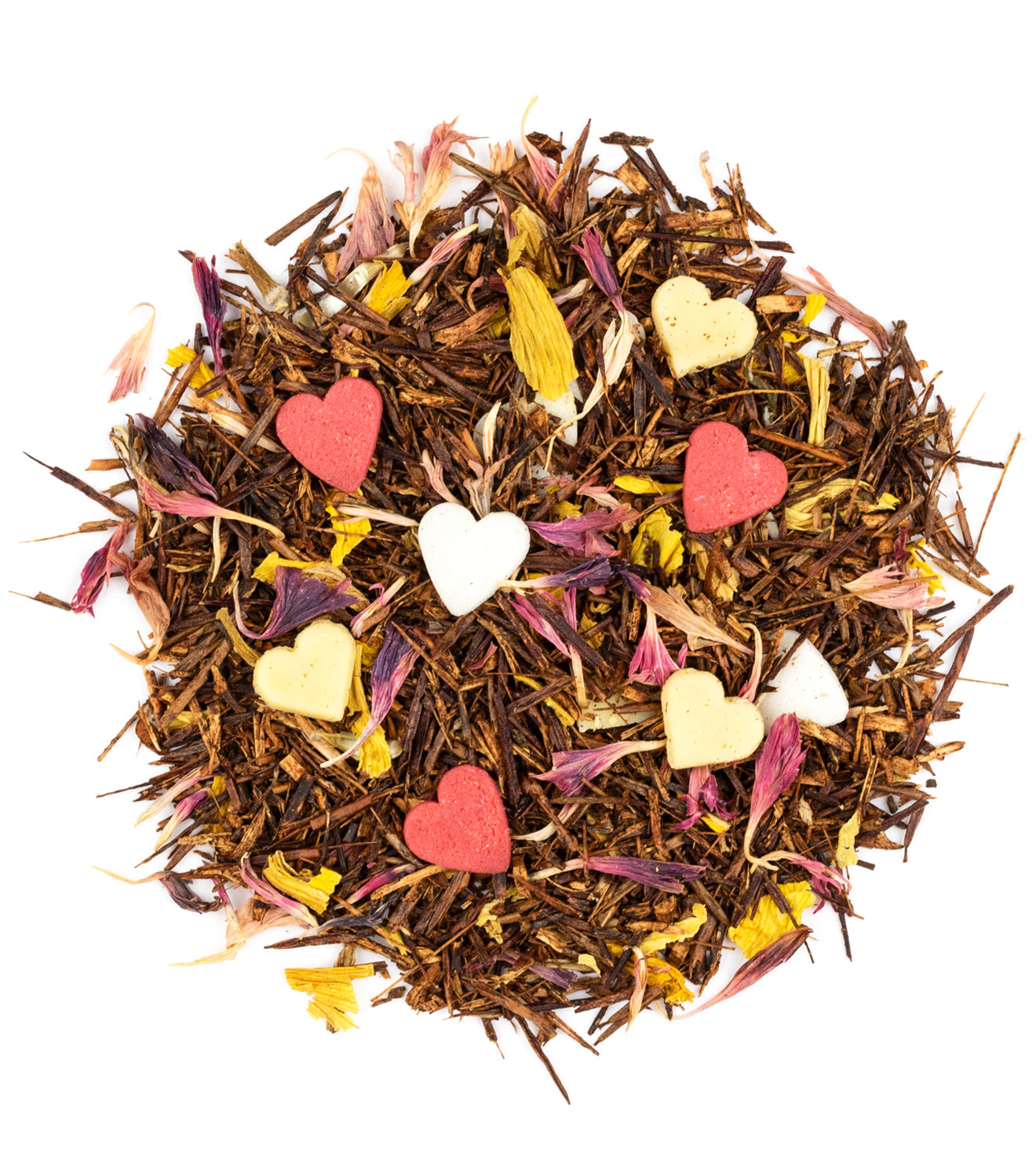 Zutaten: Rooibos, ROTE ZUCKERHERZEN (Zucker, Reismehl, gehärtetes ERDNUSSÖL, Kartoffelstärke, Farbstoff: E120, E160a, Aroma), WEISSE ZUCKERHERZEN (Zucker, Reismehl, ERDNUSSÖL teilweise gehärtet, Verdickungsmittel: Traganth, Aroma), WEISSE SCHOKOLADENHERZEN (Zucker, Kakaobutter, VOLLMILCHPULVER, Emulgator: Sonnenblumen-Lecithin), Aroma, Sonnenblumenblüten, rote Kornblumenblüten.