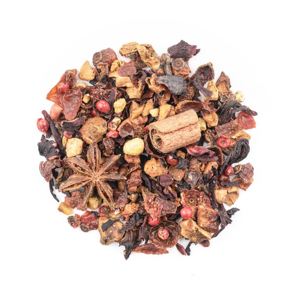 Ein Tee wie ein schelmisches Augenzwinkern. Sanft-fruchtige Apfelstücke, Hibiskusblüten und Hagebuttenschalen bilden die Basis dieses festlichen Wintertees. Zimtstangen, Nelken und ganzer Sternanis sorgen für wohlig-würzige Tiefe, während gefriergetrocknete Erdbeerscheiben eine fruchtige Überraschung zaubern. Rosa Pfeffer und Ingwer bringen eine feine Schärfe ins Spiel – charmant, frech und mit Herz.