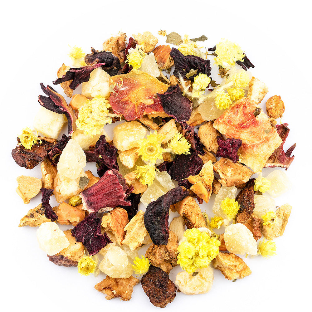 Zutaten: Apfelstücke, Ananaswürfel (Ananas, Zucker), Honigmelonenwürfel (Honigmelone, Zucker, Säuerungsmittel: Zitronensäure), Aroma, Wassermelonenflocken, Hibiskusblüten, Rote Beete, süße Brombeerblätter, Katzenpfötchen, Holunderblüten.