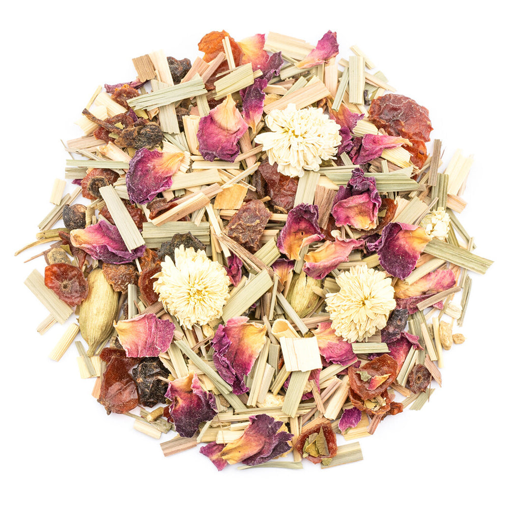 grüner Mate-Tee, Zitronengras, Hagebuttenschalen, Ingwerstücke, schwarzer Pfeffer, ganzer Kardamom, Basilikum, Rosenblüten, römische Kamille.